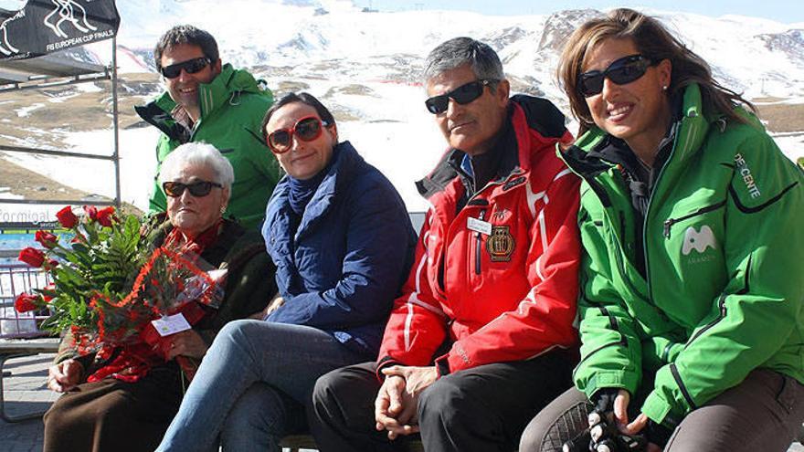 formigal. La estación Aramón Formigal recibió ayer la visita de su esquiadora más longeva, la pamplonesa Elsa Cía, que ayer cumplió 93 años. Amachu, su sobrenombre, aprendió a esquiar a los 55 años, pero desde entonces no ha faltado a su cita anual con Aramón Formigal, deslizándose por sus pistas hasta hace solo cuatro. En la imagen, de izquierda a derecha, Antonio Gericó, director de la estación; Elsa Cía, su nieta Ainhoa; Pedro Urieta, director de la Escuela de esquí; y Yolanda Yulián, responsable de acogida de la estación. Foto: cedida