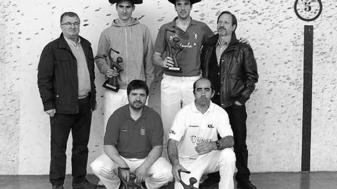 Pamplona. El Frontón López de Iturrama acogió ayer las finales del Campeonato Navarro individual de paleta goma. En Primera Categoría, Jorge París (Frontón López) se impuso en la final a su compañero Mikel Pernaute (30-11), mientras que el título de Segunda se lo adjudicó Íñigo Andueza (Frontón López), que se impuso en la final a su también compañero Andrés Pérez (30-23). En la imagen aparecen de pie, de izquierda a derecha, Montxo Iriarte (presidente de la Federación Navarra de Pelota), Íñigo Andueza, Jorge París, Pedro Pena (del Frontón López); y agachados, también de izquierda a derecha, Andrés Pérez y Mikel Pernaute. Foto: Cedida