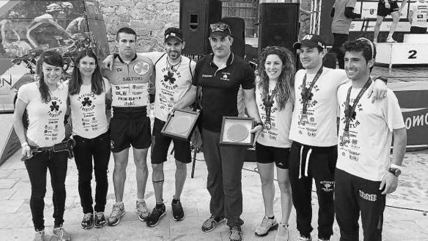 DUATLÓN. El Saltoki Trikideak protagonizó una brillante actuación en los Campeonatos de España de duatlón de larga distancia por equipos disputados el pasado fin de semana en Orihuela (Alicante). El equipo masculino, compuesto por Raúl Amatriain, Ibai Alba, Iñaki Martínez y Aritz García, logró el título, mientras que el femenino, formado por Alba Regullo, Marina Burgaya, Ivet Farriols y Maite Arraiza, se hizo con la segunda posición. En la imagen, los miembros del equipo Saltoki Trikideak posan con sus medallas y trofeos. Foto: cedida