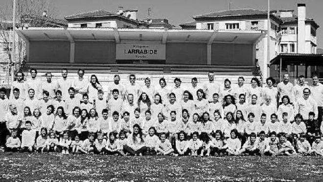 larrabide, teñido de amarillo. El club Grupo de Atletismo de Navarra, en la imagen, se hizo la foto oficial este sábado pasado, día 2 de abril, en la que posaron todas las categorías del club: prebenjamines, benjamines, alevines, infantiles, cadetes, juveniles y mayores. El estadio Larrabide de Pamplona se llenó de amarillo como consecuencia de que poco a poco el Grupo de Atletismo de Navarra va creciendo en todas las categorías, desde la escuela hasta los más veteranos. Cada día son más y mejores gracias a este deporte. Foto: cedida