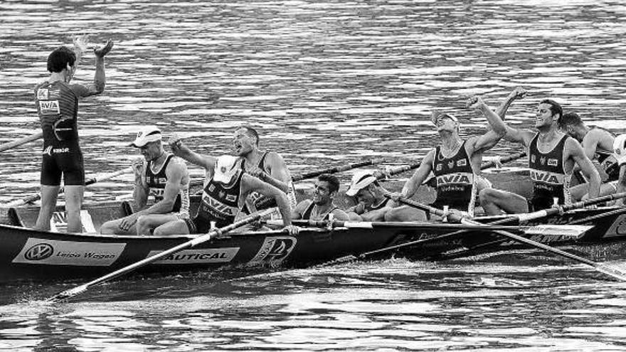 remo. Urdaibai se alzó ayer con su séptima bandera en la Liga Eusko Label de traineras al imponerse en Pasaia con una gran remontada ante su principal adversario, Hondarribia, al que no consiguió doblegar hasta torcer en el cuarto largo. Apenas tres segundos le dieron a Urdaibai el triunfo ante la Ama Guadalupekoa, que pese a su excelente regata vio impotente cómo Urdaibai (celebrando su triunfo, en la imagen) consolidaba su liderato, con 94 puntos (siete victorias y un segundo puesto), por los 85 de Hondarribia y los 78 de Zierbena. Foto: Gorka Estrada