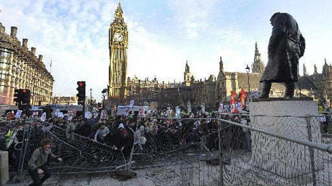 Londres. Los jóvenes que se manifestaron ayer en Londres para protestar contra el incremento de las tasas universitarias atacaron unas oficinas del Gobierno y el coche en el que viajaba el príncipe Carlos de Inglaterra, después de que la polémica iniciativa legislativa recibiese la luz verde de la Cámara de los Comunes. Un grupo de manifestantes rompió una ventana y pintó con grafiti las paredes de un edificio cercano al Parlamento, en Westmister, y se encaramaron a una estatua de Winston Churchill. Durante los disturbios, otro grupo atacó el coche en el que viajaban el príncipe Carlos y su esposa, Camila Parker, aunque ambos salieron ilesos. Foto: efe
