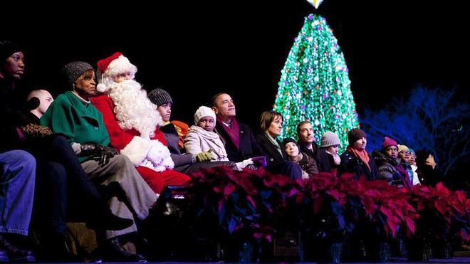 Tras la tradicional cuenta atrás, el presidente, con la ayuda de sus hijas Malia y Sasha; su esposa, Michelle, y su suegra, Marian Robinson, pulsó el botón para encender las luces del enorme árbol situado en la Elipse del National Mall.