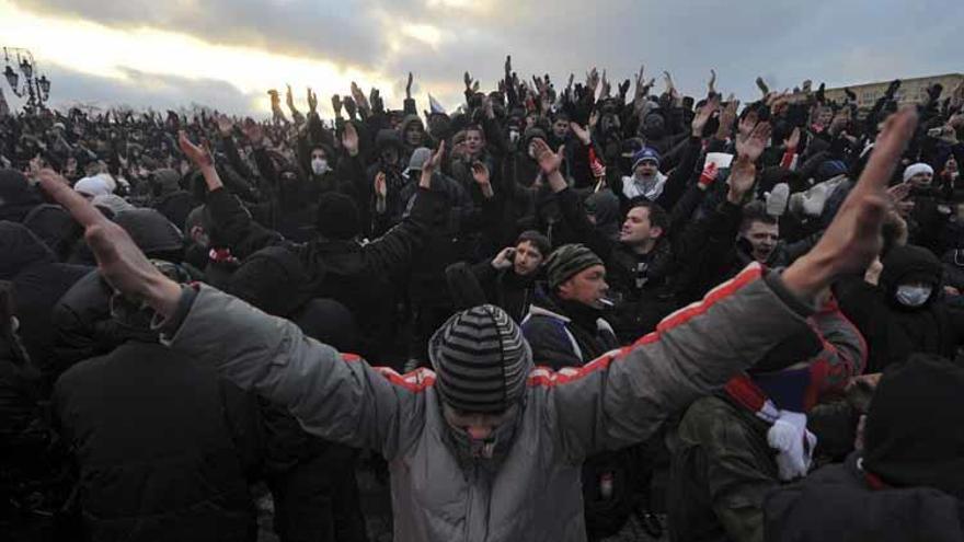 En la plaza Manezh, junto al Kremlin, donde tuvieron lugar los enfrentmientos, los manifestantes coreaban eslóganes como "Rusia para los rusos" y "Uno para todos y todos para uno" y portaban fotos de Yegor Svirídov, el hincha del Spartak de 28 años asesinado en la madrugada del lunes en una trifulca callejera.