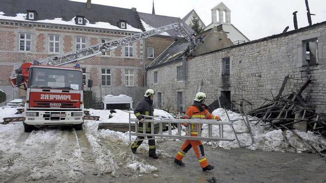 bruselas. La histórica abadía de Rochefort, en la provincia de Namur (sur de Bélgica) ardió ayer en un importante incendio que destruyó buena parte del edificio, pero no dejó víctimas. Un problema en los generadores eléctricos del edificio ocasionado por el temporal de nieve provocó el incendio que ya ha sido totalmente controlado, según informaron ayer los medios de comunicación belgas. En la imagen, los bomberos en labores de reconocimiento y valoración de daños tras el siniestro en la que buena parte de la abadía sucumbió a las llamas. Foto: efe