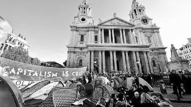 londres. Los indignados británicos han rechazado desmantelar la acampada establecida en las proximidades de la catedral londinense de San Pablo, después de que responsables eclesiásticos denunciaran que se han visto obligados a cerrar el complejo por primera ocasión desde la Segunda Guerra Mundial. Los manifestantes, que permanecen desde hace una semana frente a la catedral, han negado que sus acciones "entren en conflicto" con el normal desarrollo de la vida de la ésta, y aseguran que no se moverán de allí salvo que haya una orden judicial. Foto: efe