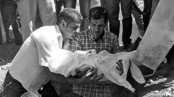 lágrimas. Aylan Kurdi, cuya imagen muerto en una playa de Turquía ha conmocionado al mundo, fue enterrado ayer en su localidad natal de Kobani, en el norte de Siria, junto a su hermano y su madre. Aylan, de 3 años, murió al naufragar el bote en el que viajaba con sus padres. Su padre, el único superviviente de la tragedia, dijo entre lágrimas mientras los cuerpos de sus familiares eran enterrados uno al lado de otro, que espera que la muerte de su familia anime a los países árabes a ayudar a los refugiados sirios. Foto: Efe