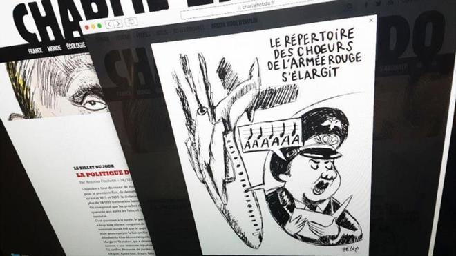 En la caricatura del polémico semanario francés se ve el avión en plena caída y a un cantante de la agrupación de coro y danza Alexándrov del Ejército ruso -que perdió a 64 de sus miembros en el siniestro- entonando un grito "a-a-a-a-a", y con una inscripción que reza: "el repertorio del coro del Ejército Rojo se amplía".