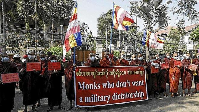 Miles de personas volvieron ayer a tomar las calles de las principales ciudades de Birmania en una nueva jornada de protesta contra el golpe de Estado de la junta militar y contra la violencia policial. En Rangún, la manifestación más concurrida fue la de los grupos étnicos minoritarios, que además de exigir el fin del régimen militar y la liberación de los presos políticos, piden una república federal y el fin de la constitución vigente, aprobada en 2008. En la imagen, monjes budistas protestas contra el golpe frente a la Embajada de Tailandia en Rangún.