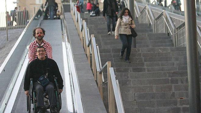 "La rampa está mal hecha porque tiene demasiada inclinación", admitió Paco Monente, quien se mueve con muletas por un problema en su pierna izquierda. "A las sillas no les da tiempo a poner el freno para no irse en picado. Incluso para las personas como yo, que nos mantenemos de pie pero tenemos problemas de movilidad, se nos hace difícil usarlas. Si apoyas primero el pie y después la muleta te resbalas, y al revés ocurre lo mismo", señaló.