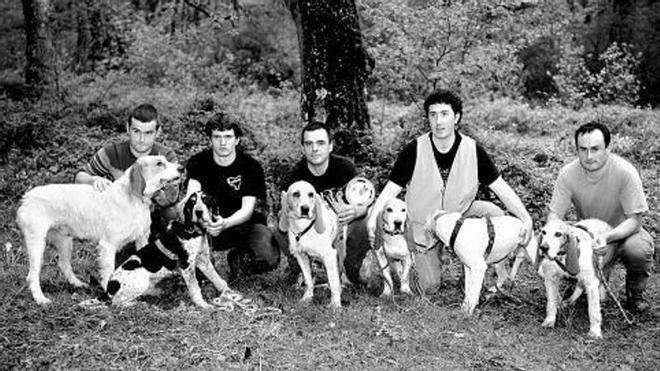 bortziriak. El lesakarra del barrio Zalain-Zoko Xabier Plaza Garbisu (segundo por la derecha) y su perro Jai se proclamaron campeones de Navarra en el II Campeonato de perros de rastro celebrado el 8 de mayo en Etxarri Aranatz, tras conseguir 153 puntos. El etxalartarra Jon Sanzberro (primero por la derecha) y su perro Bat fueron subcampeones. Junto a ellos, los lesakarras Xabier Almandoz, Agoitz Altzugarai y Miguel Ángel Maia, con sus respectivos canes, también realizaron una gran actuación en el rastreo de jabalí. Foto: FNC