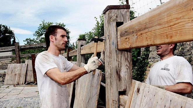PAMPLONA. Los operarios de la carpintería Hermanos Aldaz, de Puente la Reina, han comenzado hoy a colocar el vallado del encierro desde los corrales de Santo Domingo, donde cada mañana de los Sanfermines se inicia la carrera de los astados.