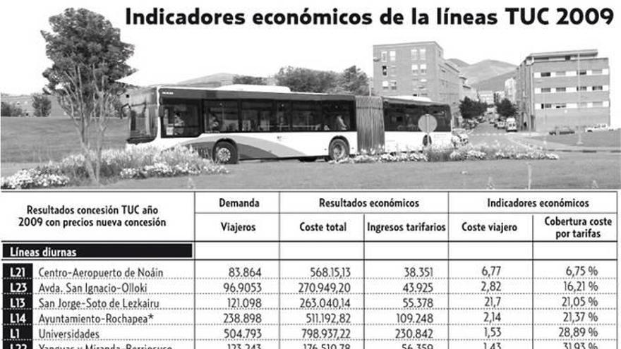 pamplona. La línea 4 de la villavesa, que une las localidades de Barañáin con Villava y Huarte, a través del centro de Pamplona, es, sin duda, la que más amortiza los costes del servicio, merced a sus más de 8,6 millones de viajeros al año, que suponen una cobertura tarifaria del 96,70%, si bien no llega ni autofinanciarse. Estos datos se desprenden del informe que la Mancomunidad de la Comarca de Pamplona presentó a la Permanente la semana pasada y que desvelan que, de las 24 líneas diurnas del transporte urbano, sólo en 13 de ellas los ingresos por las tarifas cubren más del 50% del coste; en 7 otras líneas los ingresos no cubren ni la mitad de los gastos del servicio; y cuatro de ellas estarían por debajo del 25% de cobertura tarifaria. El caso de mayor déficit de las líneas de la villavesa es, en este momento, la línea 21 del aeropuerto, implantada hace un par de años. Según datos de 2009, la utilizaron 83.864 viajeros, cubriendo apenas el 6,75% del servicio. Para que el déficit fuera asumible, tendría que costar 6,77 euros el viaje.