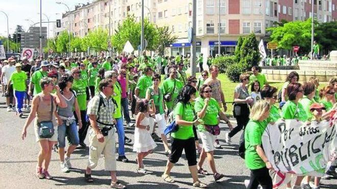 tudela. Las carreteras de la Ribera se tiñeron de verde el pasado domingo gracias a los grupos de padres, profesores y alumnos que, enfundados en camisetas del color de la convocatoria de la comunidad educativa de la zona, salieron de distintos puntos de la Ribera para cubrir la primera etapa de las ocho que componen la llamada Marcha Verde por la Educación Pública. Ni la pegajosa calorina ni los kilómetros frenaron la participación del medio millar de personas que, a las 12.00 horas, se congregó en la plaza de los Fueros de Tudela para dejar patente su rechazo a los recortes planteados por la consejería de José Iribas.