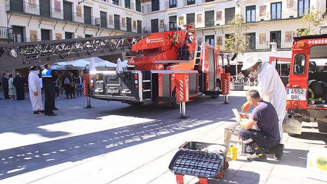 tudela. Efectivos de bomberos de Tudela tuvieron que acudir ayer a retirar dos panales de abejas, uno en la calle Gayarre y otro en la plaza Nueva, donde a primera hora de la tarde la gente que abarrotaba las terrazas se vio sorprendida por la presencia de un vehículo escala, entre otros. El aviso había llegado desde Policía Municipal, ante la presencia de un gran panal en uno de los árboles de la plaza. Los bomberos cortaron la rama en la que se había posado el enjambre, que fue capturado en una caja. Según comentaron, este tipo de concentraciones son normales por el desplazamiento de una abeja reina. Foto: n. arigita