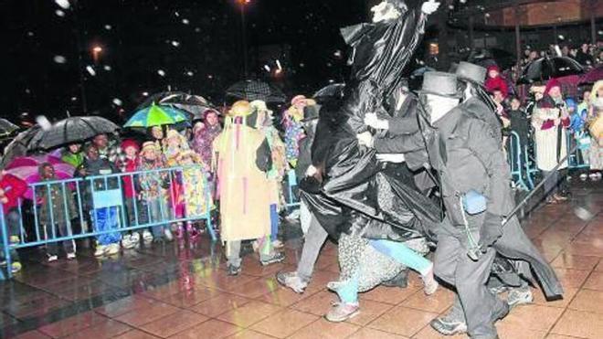 burlada. La captura y quema del muñeco que representa al malvado Lukas de Aierbe puso fin ayer tarde a la Martingala de Burlada, las fiestas de carnaval que se han prolongado durante el fin de semana. La lluvia que acompañó todo el recorrido de la comitiva carnavalesca y el acto final en la plaza Ezkabazabal, restó espectadores, aunque no desanimó a los organizadores que, no obstante, acortaron el recorrido y sacaron el muñeco solo al final. En la fotografía, Lukas de Aierbe es capturado por los jueces. Foto: Oskar Montero