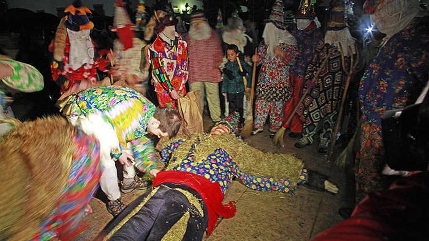 Lantz. Lantz culminó ayer por la noche uno de sus carnavales más especiales, el del 50 aniversario desde que los Caro Baroja lo recuperaran para el rodaje de la película Navarra, cuatro estaciones. Como ocurre cada año, a pesar de las inclemencias del tiempo, la última kalejira y el acto de la quema del bandido Miel Otxin concitaron por las calles de la localidad a numeroso público. En la imagen, Miel Otxin yace en suelo, ya apresado por los txatxus y ziripot, antes de ser pasto de las llamas purificadoras que anuncian la primavera. Foto: Iban Aguinaga
