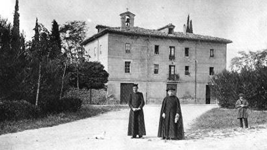 La foto muestra la entrada al cementerio pamplonés, ante la que posa el capellán, de aspecto rubicundo, junto a otro eclesiástico larguirucho. Ante ellos se ha tumbado en actitud reverente un perrito blanco, mientras que detrás posa tímidamente un "paisano" de aspecto mísero, con estatura inverosímil y trazas de haber pasado mucha hambre.