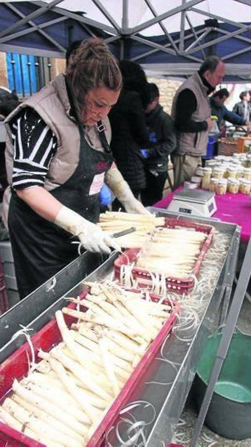 Por su parte, desde la firma Conservas Osés, de Sesma y Lodosa, también ofrecieron espárragos, que vendieron incluso pelados en el momento por una de sus trabajadoras, Rasira Afif. El responsable de esta empresa, Luis Felipe Osés, explicó que la campaña ha empezado algo más retrasada este año. “Ha venido un poco más tarde por la climatología este año pero en general sale buen calibre y grosores altos”, relató Osés. En su puesto se expusieron 500 kilos para la venta.