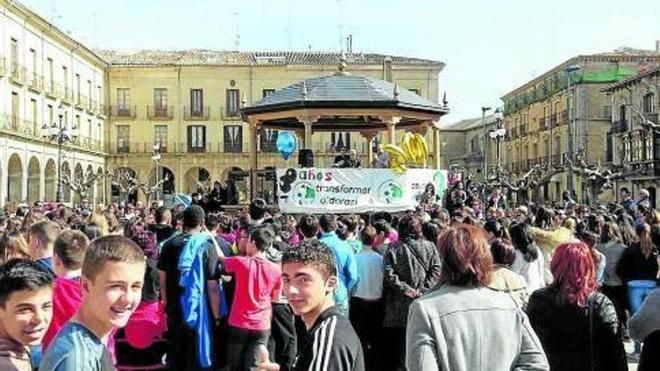 En la concentración que se llevó a cabo a partir de las 11.15 de la mañana se dieron cita los más de 600 alumnos que acuden en Tafalla a este centro pertenecientes a los ciclos de Infantil, Primaria y Secundaria, además de la plantilla que conforma el profesorado, algunos de los religiosos que residen en la casa de esta localidad y un nutrido grupo de padres y madres que llevan a sus hijos e hijas a este centro educativo.