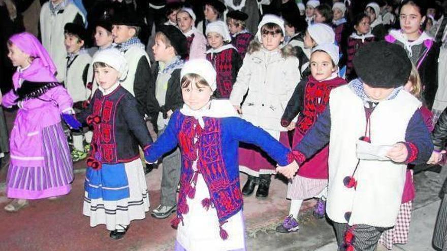 Los niños y niñas (unos 700) salen por edades intercalándose entre las carrozas, la música de acordeonistas, gaiteros, trikitilaris, txistularis, fanfarre Alkaburua, banda de Estella-Lizarra?Además de txalaparta, zanpanzares, los grupos de dantza de Larraiza e Ibai Ega y la Coral Ereintza.