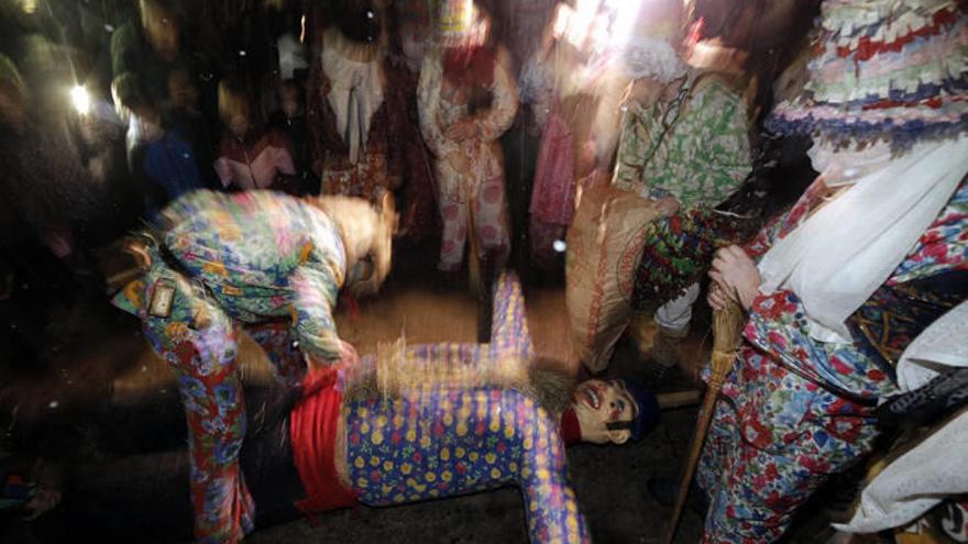 A su alrededor, ansiosos, los txatxos, que representan a los vecinos y vecinas de Lantz y llevan la cara tapada por miedo a las represalias, estaban preparados con sus escobas para brincar y gritar mientras defienden a su héroe de los ataques de Zaldiko y asustan a todo aquel que se cruce en su camino.