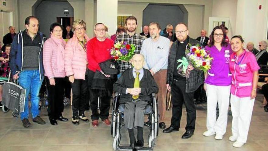 Estella-lizarra. Luis López de Dicastillo Elorz, natural de Cirauqui, cumplió cien años el pasado miércoles, 4 de abril, en la residencia San Jerónimo de Estella donde vive desde hace más de veinte años. Residentes y familiares le acompañaron durante la celebración, que tuvo lugar por la mañana en presencia del alcalde de Estella, Koldo Leoz, y del párroco de la ciudad, Óscar Azcona -que le hicieron entrega de un ramo de flores-, y también por la tarde, cuando asistió el alcalde de Cirauqui, Victoriano Goldáraz, entre otros. Foto: J.A.