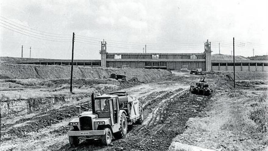 tudela. Esta foto, tomada en 1969, muestra otra de las caras que supuso para Tudela la construcción del nuevo campo de fútbol lejos del antiguo Griseras. Su emplazamiento, lejos de la ciudad, supuso también la urbanización de una nueva calle, la avenida de Argentina, y de toda una zona cercana al cementerio. Al fondo se ve el estadio en el que se están levantando las torres que dan personañlidad al campo. foto: josé miguel buñuel