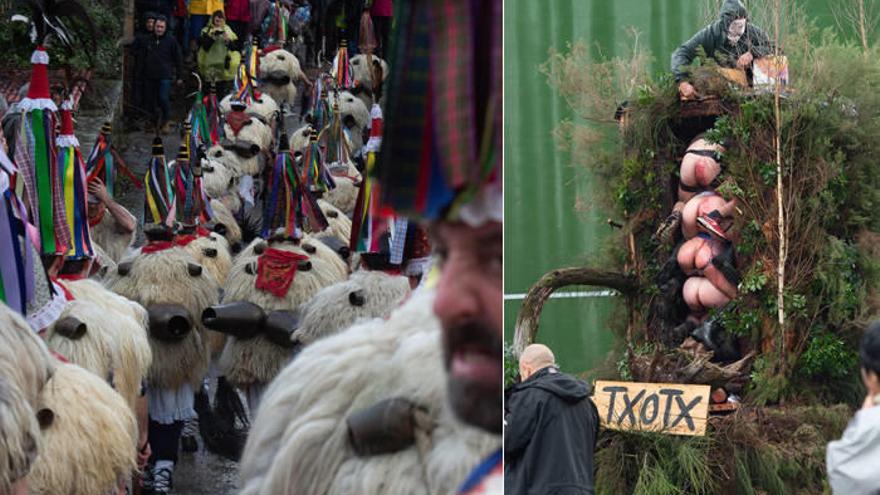 “Los joaldunak tienen sus reglas, sus vestimentas, su recorrido? A nosotros y nosotras nos gusta meternos en este juego en el que no hay reglas y montar nuestro propio show”, señalaba uno de ellos. Y a fé que lo lograron. Algunos, vestidos apenas con bikinis y máscaras de lobos, se embadurnaban de crema para el sol (?), entorpeciendo el paso a los joaldunak, mientras otro con una podadora de ramas, les realizaba su particular “depilación”. Otros, realizaron su fuente txotx, con culos en fila y al aire, regados desde arriba, y con el ruido de motosierra de fondo. El esperpento en todo su esplendor.