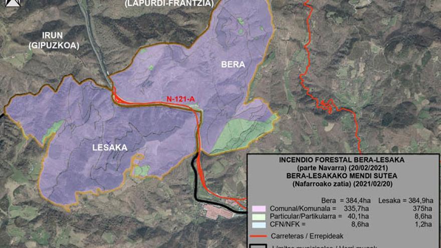 El incendio ha afectado concretamente a 769,3 hectáreas pertenecientes a los términos municipales de Bera y Lesaka. Se da la circunstancia de que la superficie quemada es prácticamente la misma en ambas localidades, 384,4 hectáreas y 384,9 hectáreas, respectivamente.