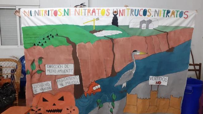 Los vecinos empezaron a hablar por WhatsApp para ver cómo plasmar este conflicto y poco a poco la idea fue cogiendo forma: las calabazas que bajan por el río representan al Gobierno de Navarra, a la dirección de Medio Ambiente y al Ayuntamiento, el ojo del Señor de los Anillos, es para la granja, y el pez refleja el río y su contaminación. Además, aparece el castillo en el que ondea una bandera con un 'Vertidos no', lema que se puede leer en muchos balcones del municipio, y la frase que predomina reza 'Ni nitritos, ni nitratos. Ni trucos, ni tratos'.