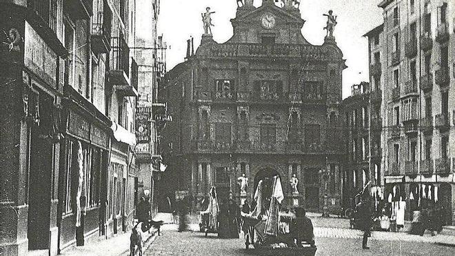 En 1905 todavía se permitía la instalación de puestos de venta callejera en la plaza Consistorial, que en el caso que nos ocupa, y según dejó escrito J.J. Arazuri, se trataba de la venta de simples baratijas. Antes, hasta 1864, solían instalarse enormes puestos de venta de fruta, y la propia plaza era comúnmente conocida como “plaza de la Fruta”, cosa que quedó documentada en una única y valiosísima fotografía, que en su momento ya publicamos.