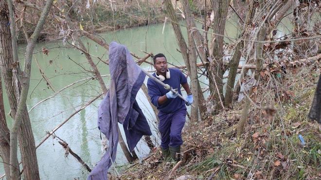 "Estoy cansada de recoger toallitas, toallitas y toallitas. Se agarran bien a las hojas y a las ramas y les cuesta salir. Hay que estar dándoles vueltas", comenta Teresa Luques, trabajadora del tajo de Mantenimiento del Parque Fluvial, que desde el 13 de diciembre retira restos de basura, plásticos y deshechos acumulados por la riada.