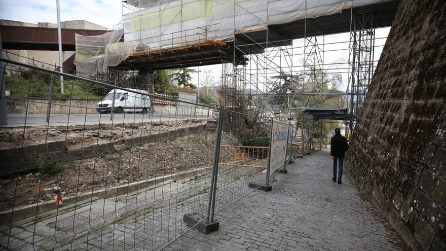 El vallado metálico instalado entre el frontón y el puente de la Magdalena delimita el ámbito de las diversas actuaciones que se están llevan a cabo a la vez.