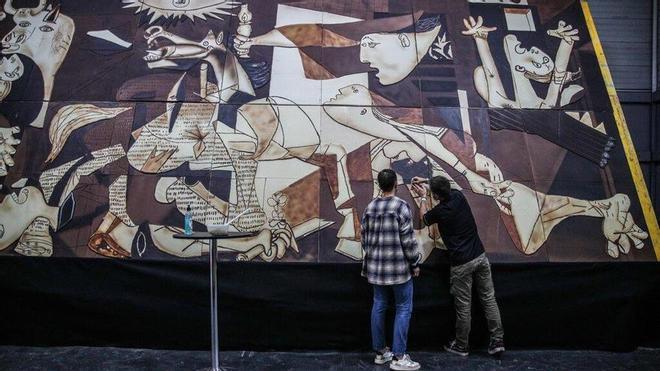 La primera réplica en chocolate del Guernica, el emblemático cuadro de Pablo Picasso, llega el próximo 8 de junio al Palacio Condestable de Pamplona, después de visitar la capital parisina, bilbaína, donostiarra y gasteiztarra, con el objetivo de conmemorar el 85 aniversario del bombardeo de Gernika. El cuadro de más de 400 kilos de chocolate cuenta con 14 paneles, que soldados entre sí forman las mismas dimensiones que el lienzo original -7,77 metros de largo por 3,49 de ancho-. "Lo dividimos para trabajar y transportar de forma más cómoda", señala el pastelero de la panadería Sarobe S.L. de Bera, integrante navarro de la Asociación Gozoa, Iñigo Sarobe.
