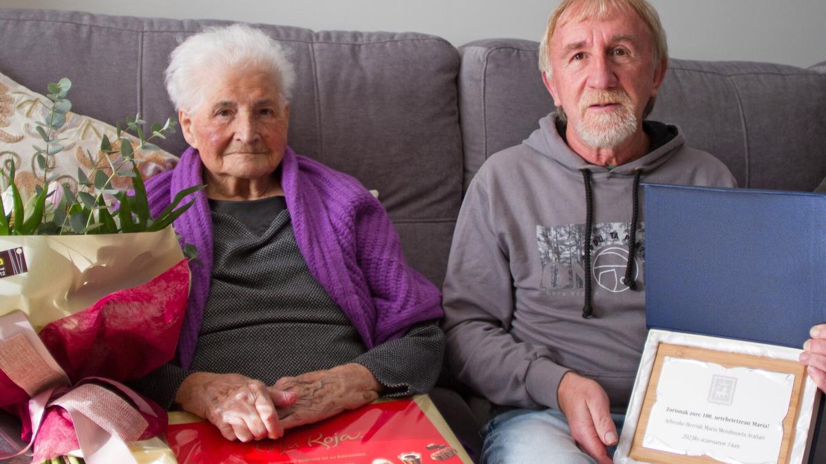 María Mendinueta Araña cumplió el pasado martes 100 años de vida, un aniversario especial que celebró con su familia y amistades al mediodía. Asimismo, el Ayuntamiento de Arbizu no quiso pasar por alto el centenario de su vecina, y de la mano del alcalde, Francisco Javier Razkin, le entregó una placa conmemorativa de este aniversario redondo, un ramo de flores y bombones. Por la tarde, el grupo de Kantuz de Arbizu acudió a felicitarle a la puerta de su casa con canciones.