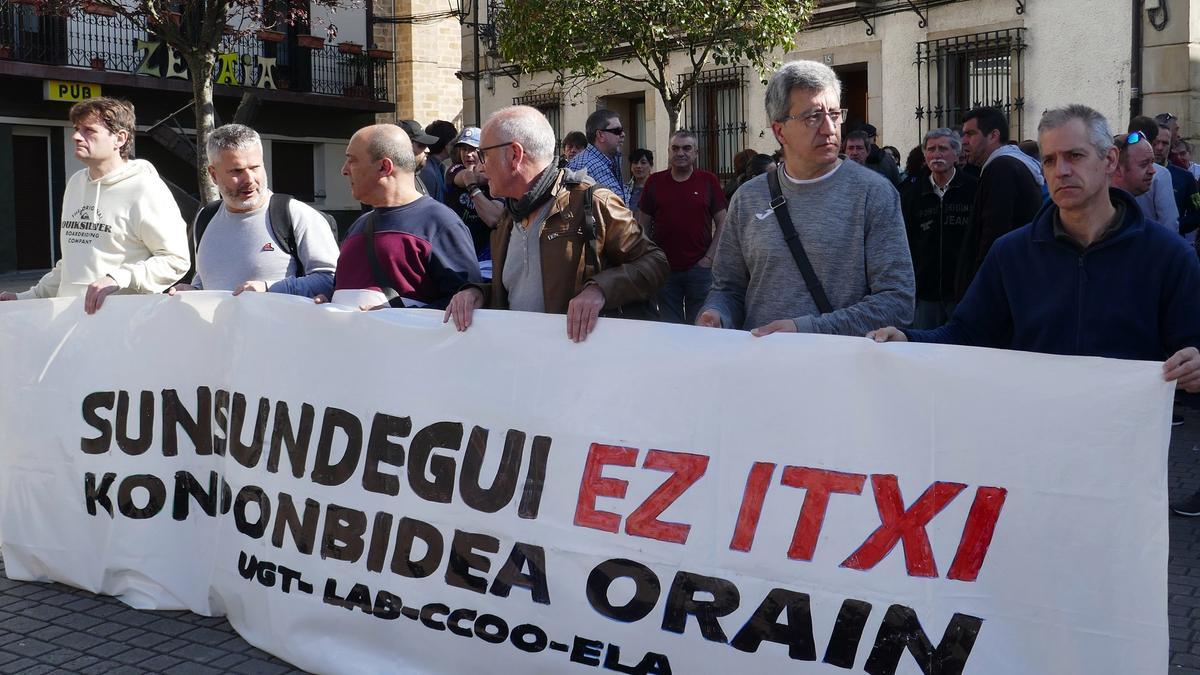 “Hemos agotado los 90 minutos de juego y estamos en la prórroga”, señaló Oskar Telletxea, delegado de LAB en el comité de empresa de Sunsundegui, tras la concentración convocada para ayer al mediodía. Y es que cada vez está más cerca el 14 de abril, fecha en la que comenzaría el proceso de liquidación de la carrocera de Altsasu de no existir ninguna oferta. “Seguimos igual, sin un plan industrial y un inversor. Estamos en los últimos momentos pero vamos a pelear hasta el final para no dejar a casi 340 personas en la calle”, aseguró.