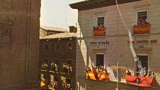 Desde pocos años después de que terminara la Guerra Civil, sin que haya constancia de la fecha, el Consistorio decidió colocar en la fachada varios lemas “Viva España”, “Viva Navarra”, “Viva Cristo Rey”, “Franco” y “Mola”. Como una losa para quienes sufrieron la represión de los golpistas y de aquel régimen, adornaban el edificio que era emblema del poder popular sin que nadie percibiera algo extraño en ello. Nada existe en el Archivo sobre cuándo se retiraron los nombres de Franco y Mola, aunque todo apunta a que se llevó a cabo a principios de 1977, y de madrugada.