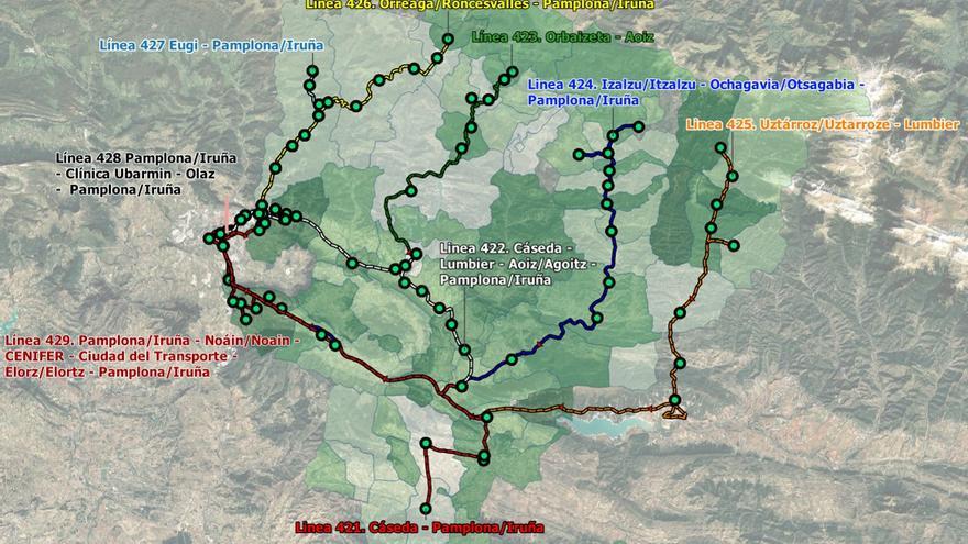 Así, el nuevo servicio se ha estructurado por servicios regulares y servicios a la demanda. Las líneas regulares conectarán Pamplona, Cáseda, Sangüesa / Zangoza, Lumbier, Aoiz / Agoitz, Ochagavía / Otsagabia, Orbaizeta, Uztárro / Uztarroze, Orreaga / Roncesvalles, Eugi, Clínica Ubarmin y Ciudad del Transporte, con paradas en localidades intermedias. Las líneas a la demanda conectarán las localidades de menor tamaño con las cabeceras comarcales en Sangüesa, Lumbier, Zubiri, Garralda y Espinal, donde se podrá conectar con Pamplona.