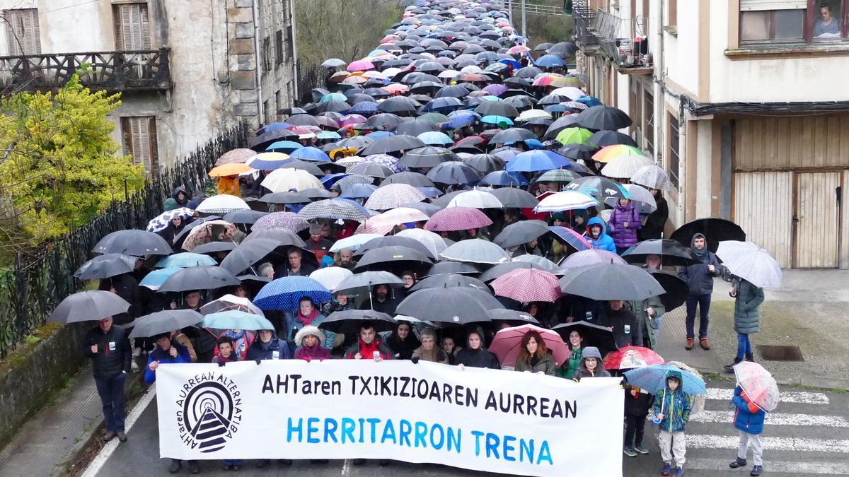 Bajo la lluvia, miles de personas, cerca de 5.000 según la organización, se manifestaron el sábado en Altsasu convocadas por la plataforma por el Tren Público y Social de Iza, Sakana, Goierri y Llanada alavesa con el lema AHTren txikizioaren aurrean Herritarron Trena “Queremos tren, sí. Pero un tren que conecte pueblos y personas, no uno que pase por encima de los pueblos”, destacaron al final de la manifestación Arrancó en el parque de bomberos, precedida por 25 tractores, zanpantzar y algunos de los muñecos mitológicos de Iskidi. y finalizó en la plaza de Los Fueros después de recorrer las principales calles de la villa.