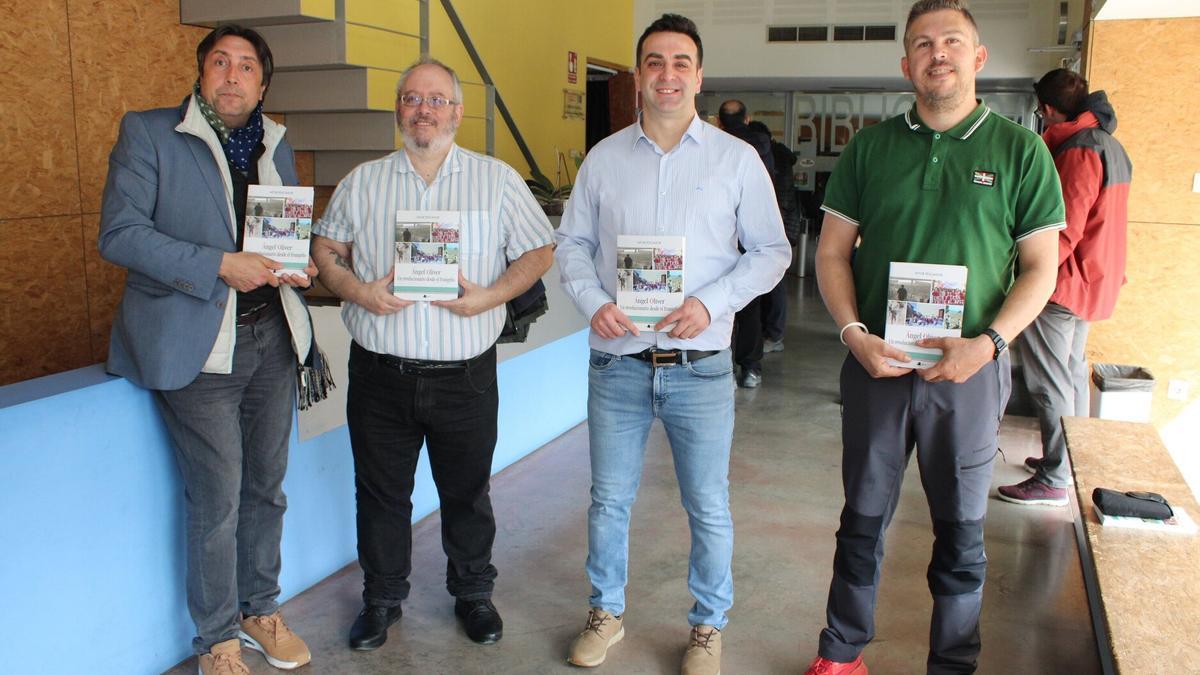 En la presentación del libro estuvieron Juantxo Oliver, hijo de Ángel Oliver, el alcalde de Ablitas Carlos Bonel, Peio Elzaburu, de Editorial Pamiela, y su amigo Jorge Hualde, que leyó un mensaje de José Mari Oliver hermano de Ángel que tiene 91 años y ya no puede viajar.