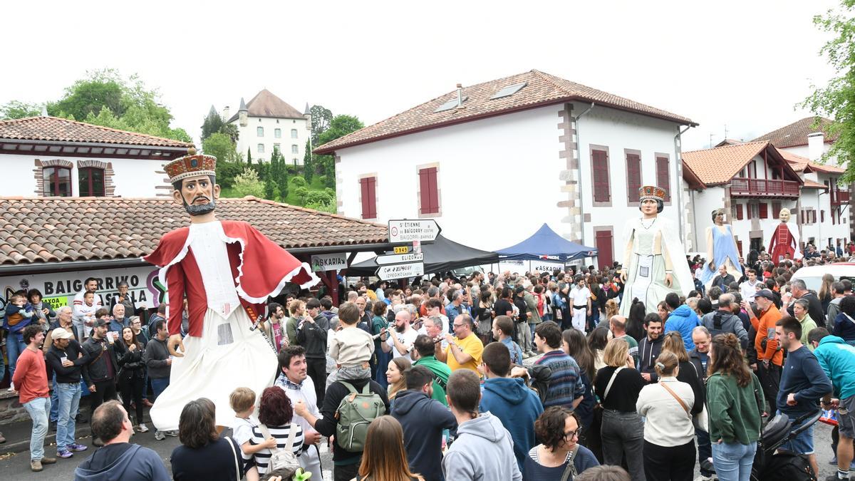 El desfile lo abría, igual que el año pasado, las Basandereak y los Basaldunak, cada año son más, tras ellos y ellas llegaban los Gigantes de Baigorri e Irisarriko Dantza Taldea. A la txaranga de Uztaritz le seguía los Makilariak de Anhauze. Junto a la txaranga Ezpela y los gaiteros llegaba Kilimon, los gigantes creados en 1989 que representan a los tan queridos bertsolaris, Mattin y Xalbador.