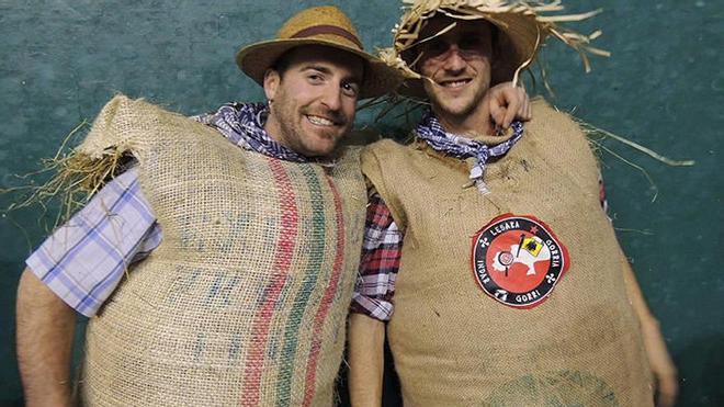 Además del desfile en sí, el protocolo ineludible de llenar los sacos de paja, coserlos y ponerse el pañuelo blanco que cubre la cara tuvo que desplazase por la lluvia desde la coqueta plazoleta entre las casas Kastillobaita, Grazienea y Huartea al interior del frontón, donde se reunieron muchos curiosos, que querían ponerle cara a los personajes que salen embozados con un pañuelo blanco, zapela, sus sacos rellenos y golpean a diestro y siniestro con la pizontzia (vejiga de cerdo seca).