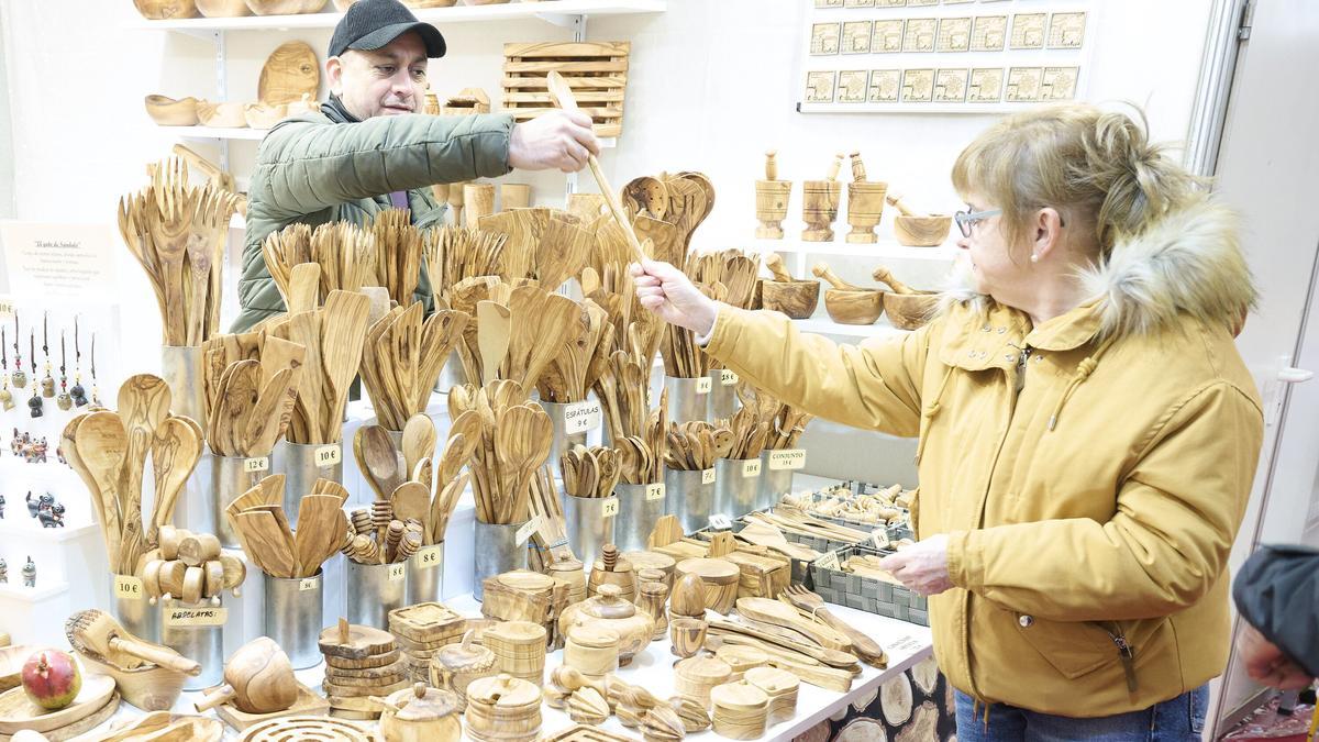 En el puesto dedicado a las herramientas de cocina de madera, llamado Artesanía en Olivo, te atiende Wilfred Macancela, que lleva siete años detrás del expositor. De toda su oferta de utensilios para la casa, son los cubiertos y tablas los productos que más vende. Aunque también siente que los primeros días de este año han sido más flojos, en cuanto a asistentes, “en los últimos años ha ido a más”, aclara.