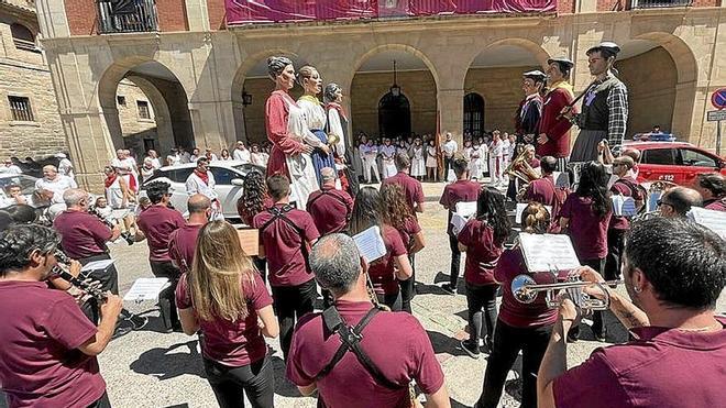 La comparsa de gigantes, al son de los gaiteros, así como los miembros de la banda de música que dirige José Mª Ezquerro, se encargaron de acompañarles hasta la parroquia y después, y como novedad en el programa, esta última formación realizó un pasacalles por el casco urbano.
