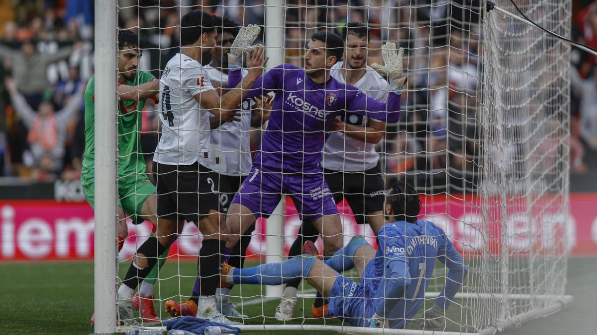 Osasuna puso muy pocos argumentos sobre la mesa para reclamar los tres puntos. Perdió el partido tras un saque de suelo de Sergio Herrera en el que el Valencia ganó la pelota y en tres toques Sadiq, que venció en la carrera a Herrando, se presentó ante el portero rojillo, que cometió penalti sobre el delantero. Fue el único error defensivo gordo en una tarde en la que el déficit estuvo en el ataque, sin ningún remate entre los tres palos, a pesar de terminar el partido con Budimir y Raúl García de Haro en el campo.