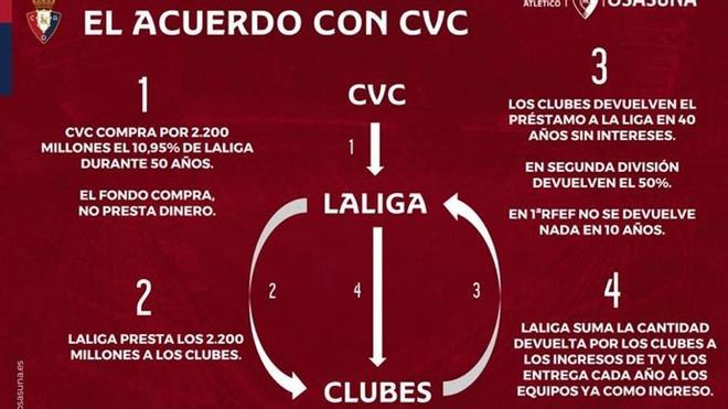 Este acuerdo de la Liga con CVC, que fue aceptado por la Asamblea del C.A. Osasuna, supuso unas pérdidas para este club de 5,1 millones de euros en la temporada 22/23, unas pérdidas que vienen producidas precisamente por el uso del préstamo de CVC por parte del conjunto navarro para confeccionar la plantilla del equipo. En cuanto a la deuda neta, en junio de 2023 era de 61,6 millones de euros, un millón de euros por encima del dato conocido en diciembre de 2022, que la situaba en 60,6 millones de euros. La temporada 24/25 Osasuna tuvo un beneficio de 2 millones de euros. La deuda neta del club era de 60,4 millones a 30 de junio de 2025.