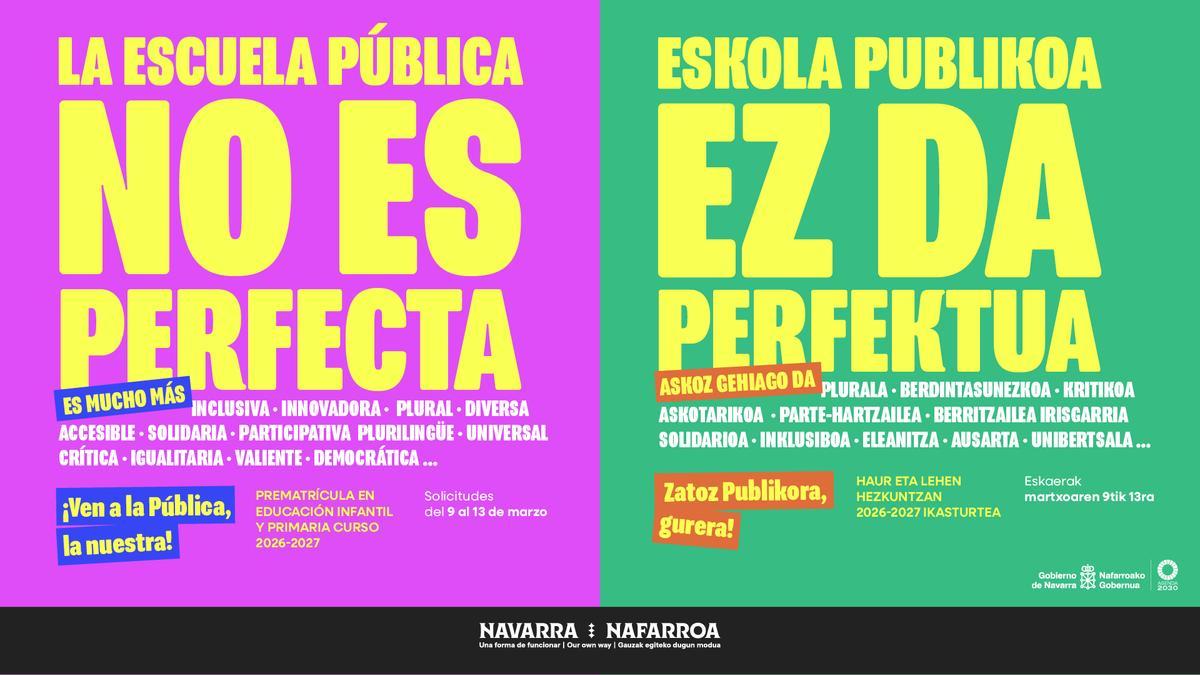 El pasado 2 de marzo, el Departamento de Educación puso en marcha la campaña de matriculación en la educación pública para el curso 2026-2027 bajo el lema La escuela pública no es perfecta. Es mucho más. Anualmente en torno a estas fechas, el Gobierno de Navarra invita a las familias a confiar en un sistema que, desde hace décadas, constituye el principal pilar educativo de nuestra comunidad.