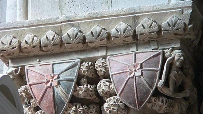 Los primeros escudos heráldicos, nobiliarios o si se prefiere de armas, tienen sus inicios en el siglo XII, concretamente en torno a los años 1120 y 1140. En ellos los reyes y también señores o nobles buscaron colorear los escudos para diferenciarse con ello del resto. Los escudos llevaban incorporados blocas y/o refuerzos de metal, que protegían la superficie exterior del escudo ante los golpes de lanzas, espadas, mazas y hachas, con la única función de que los escudos no se descompusieran, ya que los escudos medievales no estaban fabricados inicialmente con metal, sino que eran elaborados con listones de madera que las blocas aseguraban. Por ello, son las armas más antiguas aquellas que son plenas al poseer solo un color. Tan habituales eran las blocas en los escudos medievales, que estas han sido el mecanismo que ha determinado los posteriores fraccionamientos que hoy podemos apreciar en los escudos o blasones. Concretamente, las primeras armas de Nabarra son de gules o rojo pleno y datan de tiempos de Sancho VI el Sabio (1150-1194). Las armas de Nabarra solían representarse con blocas superpuestas, estando las blocas formadas por ocho brazos flordelisados con el carbunclo en el centro, de manera que contribuían a reforzar el escudo rojo de Nabarra. Así está detallado en uno de los relieves situados junto a la portada de la iglesia de San Miguel Arcángel en Lizarra-Estella. Estas representaciones no son consideradas, por la mayoría de los heraldistas nabarros y del resto del mundo, específicas para las armas de Nabarra, ya que las blocas no son muebles heráldicos sino, como hemos dicho, son refuerzos del escudo; pero también debemos saber que aparece así en la Biblia ilustrada editada en el año 1197 tras petición o mandato de Sancho VII el Fuerte (1194-1234). Las armas personales que portó el sucesor nabarro de el Sabio, Sancho VII el Fuerte, era un águila de sable o negro en fondo de gules o rojo, si bien, algunos heraldistas españolas afirman que el fondo era de plata o blanco, mientras que posteriores interpretaciones realizadas desde el nacionalismo vasco de mediados del siglo XX, afirman que el águila de sable estaba sobre fondo de oro o amarillo. Al acabar con este rey la dinastía vascona de la casa Jimena, el siguiente rey ya de la casa de Champaña, Teobaldo I el Trovador (1234-1253) buscó las armas más antiguas de Nabarra para diferenciarlas de las que poseía por sus condados de Champaña y Brie ante la petición de las Cortes nabarras. Por ello retrocedió hasta los tiempos de Sancho VI de Nabarra cogiendo sus armas, pero añadiéndoles lo que dilucidó como parte de las armerías, es decir, el carbunclo y las blocas sobre el escudo. Concretamente el carbunclo tomó forma de trébol de cuatro hojas, incluso en alguna otra representación tiene forma de flor de lis, y con las blocas, los ocho brazos o barretas, que perdieron sus flordelisados y se cerraron, algo que podemos admirar al contemplar los escudos de Nabarra grabados y posteriormente pintados en diversas columnas de la Catedral de Tutera-Tudela. Este y no otro, es el origen verdadero del escudo del Estado de Nabarra. Conforme van transcurriendo los tiempos, el mismo rey o quizás alguno de sus sucesores de la misma casa nobiliaria, añadió los besantes o pomas en los brazos de una manera siempre homogénea y simétrica, algo que podemos observar en los escudos labrados en la fachada exterior del convento de Santo Domingo de Lizarra-Estella. La representación heráldica de las cadenas ganadas en las Navas de Tolosa fue posterior a lo expuesto anteriormente, concretamente en torno a mediados del siglo XV… pero esa ya es otra historia.