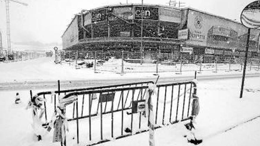 la estampa del Reyno de Navarra bajo la nieve, con un manto blanco, fue la más requerida por los informativos de televisión. Una imagen de un campo de fútbol de Primera nevado siempre tiene su punto de espectáculo y si es el Barcelona el siguiente visitante que se va a dar una vuelta por ahí, ya es un cataclismo de altura. Pero visto el panorama, correspondió a Osasuna poner los primeros remedios para que hoy se disputara el partido. Un total de 15 operarios, ayudados por cuatro máquinas, trabajaron desde las 12.00 horas hasta las 20.00 para retirar la nieve acumulada. Una meritoria labor porque nevó en varias ocasiones a lo largo de la jornada y el espesor de la nieve acumulada en el estadio iba de los 8 a los 10 centímetros según las zonas. Las previsiones meteorológicas, anunciando un descenso de las temperaturas muy acusado durante la pasada madrugada, aconsejaron trabajar rápidamente para impedir hoy un campo helado, peligroso.